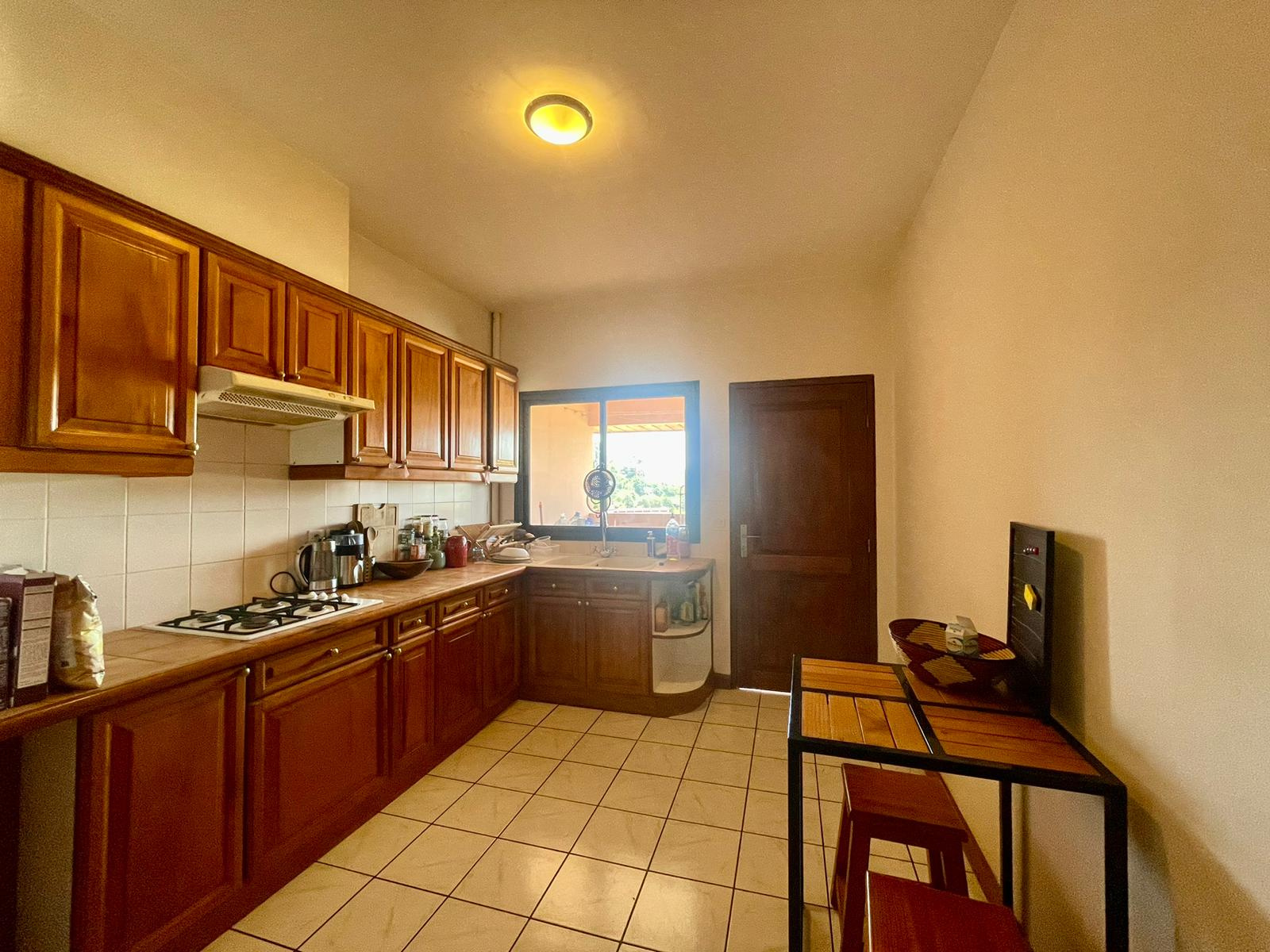 - *Une cuisine équipée* avec un placard en palissandre et une gazinière,
