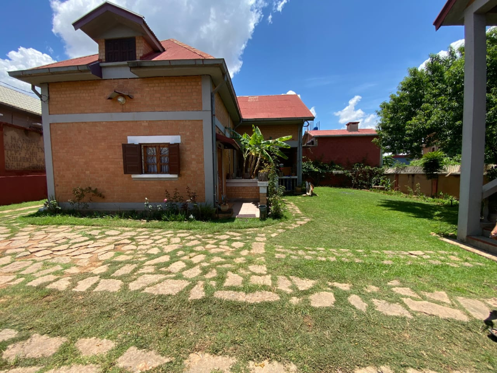 Difiée selon les règles de l’art :Fondations en moellons de granitStructures en béton arméMurs extérieurs en briques pleines apparentesToitures en tôles peintes rouge, signature architecturalePlafonds en voliges bouvetéesMenuiseries en bois massif de forêt, façonnées avec soinGrilles de protection en ouvrage d’art métalliqueSols carrelés au RDC et salles d’eauExcellent état général – vétusté maîtrisée à 10 %